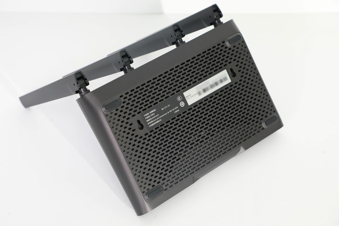在机身底部,Redmi AX5400 分布着许多散热开孔,可以保证了正常工作环境下的散热能力。此外,路由器顶部也有一块区域负责散热。