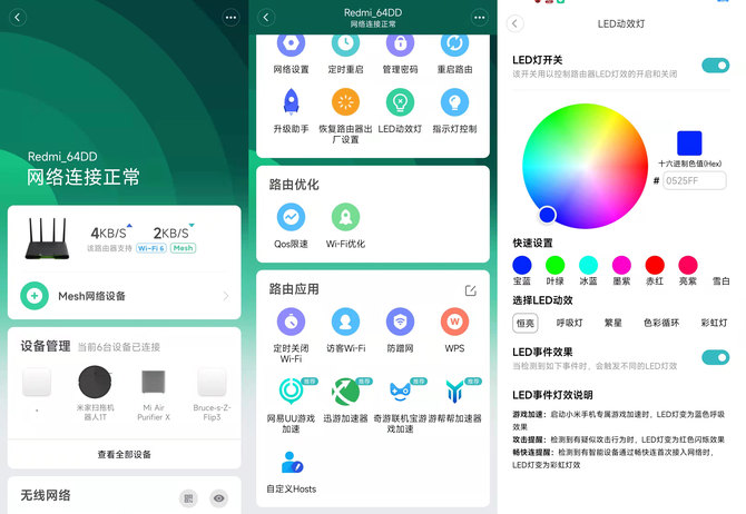 在AIoT互联体验方面,Redmi 电竞路由器 AX5400同样也支持小米畅快连:通过米家App与登陆的小米账号,就可以自动发现身边未配网的小米智能设备,一键轻松入网,如果是之前已经连接到其他小米路由的设备,更换之后登陆账号可以直接无缝切换,无需手动操作配网。